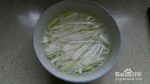 大葱取一寸长的两段,切成丝,用清水漂一下。既去掉一些呛味,又能使葱丝卷曲好看。