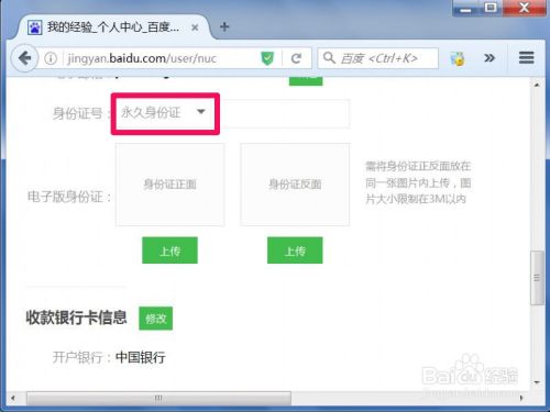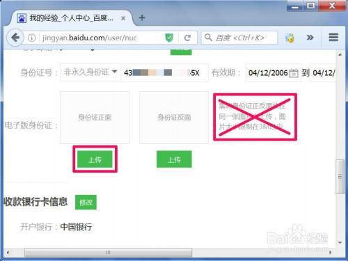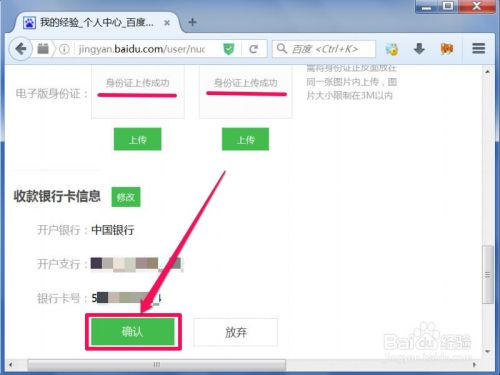 身份证正反两面都上传成功后,就是填写银行卡信息,之前提交过的,跳过此步,就不要修改了。没提交过帐户信息的,把开户银行,开户支行,银行卡号填写上。在提交前,仔细检查一下上面所有项目是否正确,花点时间,多检查一下不要紧,因为一旦有错,要修改起来很麻烦的。确认都正确后,点“确定”进行提交。