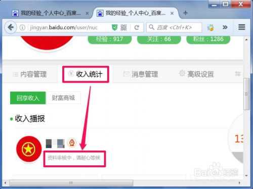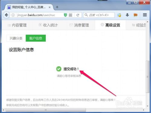 点了“确定”后,没有任何反应,不要以为没提示,反复去点“确定”,如果不确认是否提交成功,先不要关闭此页,再打开一个网页标签,重新进入“高级设置”选项,就能看到以下“提交成功”提示,或者进入“收入统计”,也会看到“资料审核中,请耐心等待”的提示。