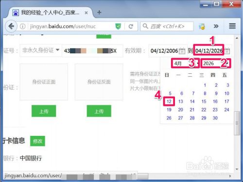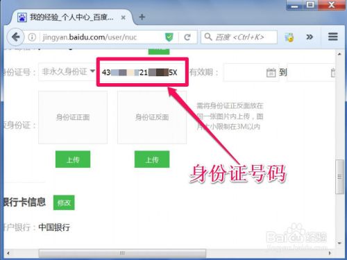 身份证号码填好后,再上传身份证正反两面的图片,按“身份证正面”下的“上传”按钮。