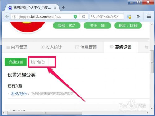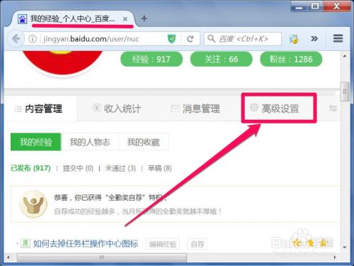 准备工作做好后,打开浏览器,进入百度经验个人中心,选择“高级设置”。