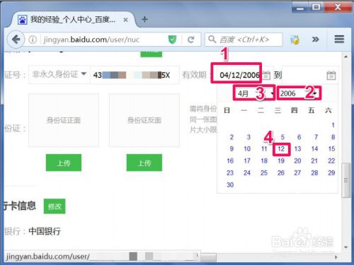 再填写有效期,这个有效期身份证上有,看一下便知,先填发证日期,选择年月日,注意,在编辑框中显示的的顺序是日,月,年,以/分隔开。