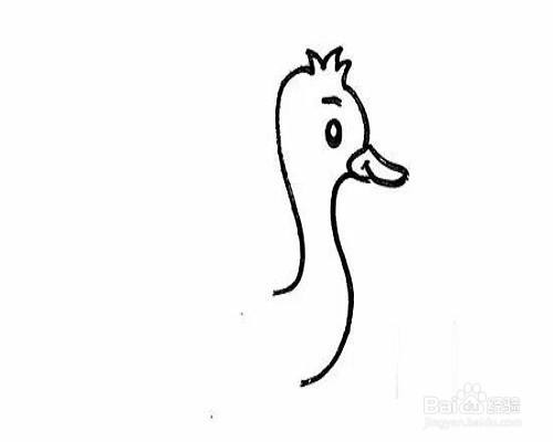 首先画出鸵鸟的头部,画出它细长且弯曲的脖子,头顶画上一撮毛发,画出圆圆的眼睛和扁扁的嘴巴