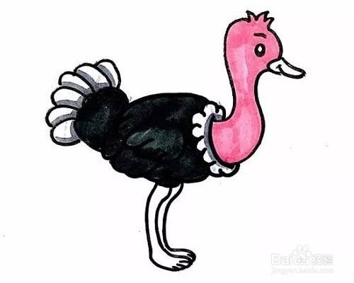 开始涂色吧,先给鸵鸟的头部涂玫红色,身体涂上黑色,羽毛的边缘涂灰色