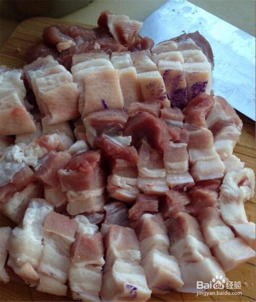 把五花肉用刀切成小块状,每一块肥肉和瘦肉都有