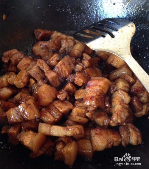 炒肉后看到每一块肉上都上色了,就用老抽酱油上色,翻炒均匀。