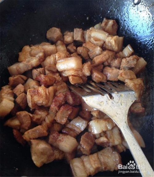 将焯水后的五花肉块导入锅中,开始翻炒