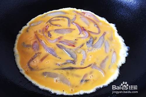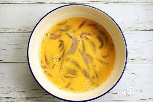 将3个鸡蛋磕入碗中,放入一小捏的盐,1勺黄酒,搅打均匀,再将面条鱼放入蛋液中,轻轻搅匀备用。再将另外一个鸡蛋放在另外一个容器里打散成蛋液备用。