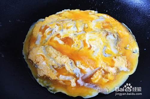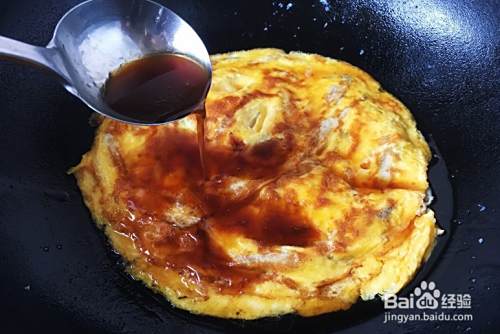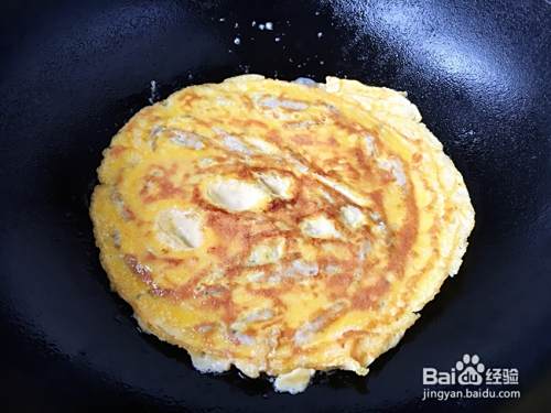 待鸡蛋液凝固后大翻勺,使其翻面,然后沿锅边淋入20克左右的油,改小火再将其煎透(不会大翻勺的话可借助两个铲子反面)。