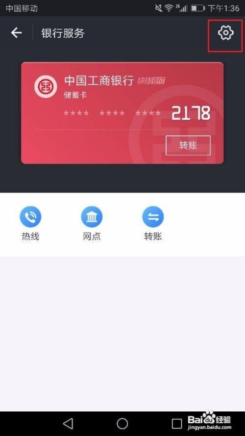 点击银行卡的红色区域,在银行服务中右上角的设置标志,点击一下这个标志。