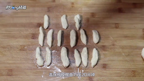 盖保鲜膜醒面15~20分钟,醒好搓成6cm长条。