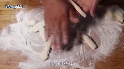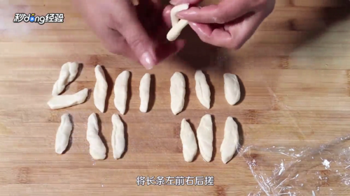将长条左前右后搓,两边提起,自然拧上,再向前搓。