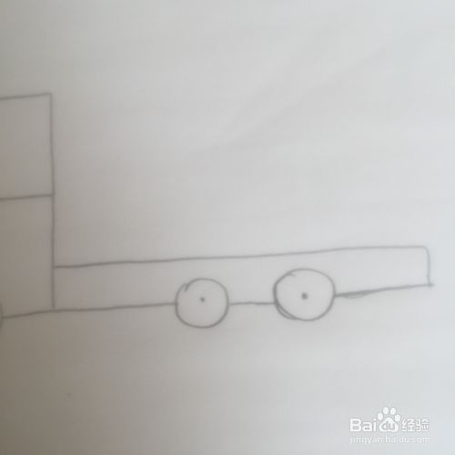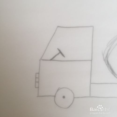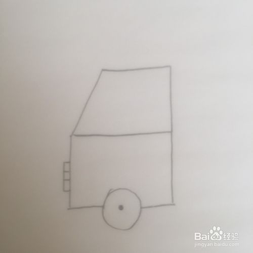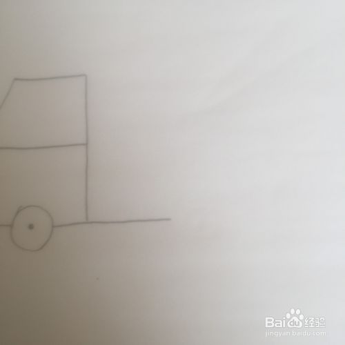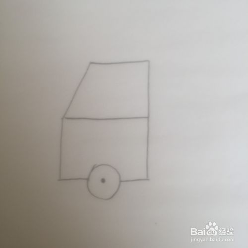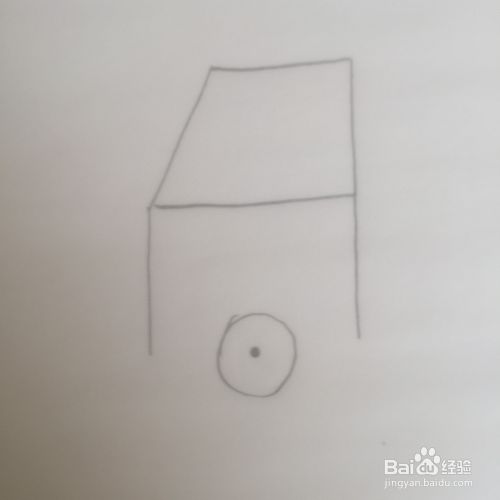 梯形的左右两边向下延伸,长短要一样。在下面的中间处画一个圆圈代表轮胎。