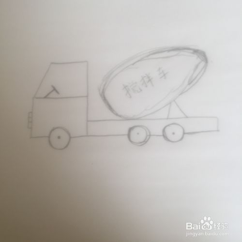 接着在轮胎上面横折,把搅拌车的底盘画好。
