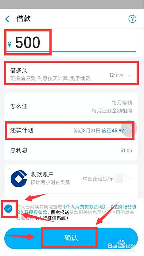 确认借钱的时间,以及具体的还款计划,勾选同一协议图标,点击下方的蓝色确认图标。