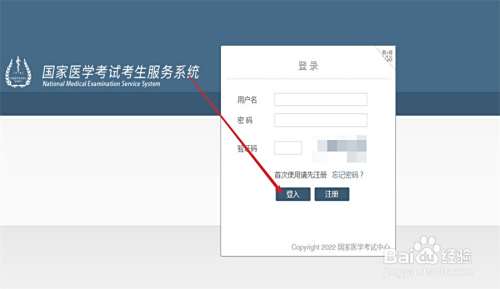 打开国家医学考试考生服务系统,输入用户名和密码,点击登入。