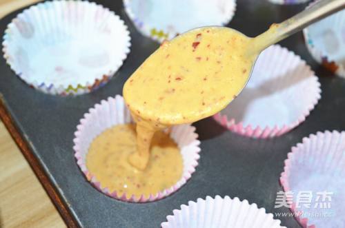 9用勺子将搅拌均匀的面糊舀入纸杯中,大概7-8分满,依次做完所有;