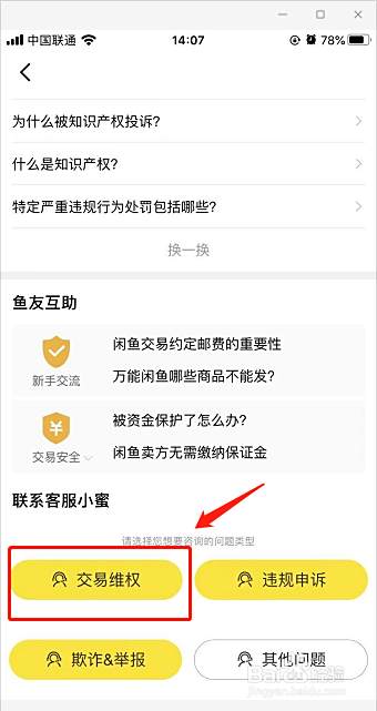 下拉页面,联系闲鱼客服,选择【交易维权】反馈。
