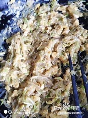 西葫芦丝攥干水分,放入空盆中,加入鸡蛋碎,粉条碎,蚝油,拌匀,适当调调口味的咸淡。