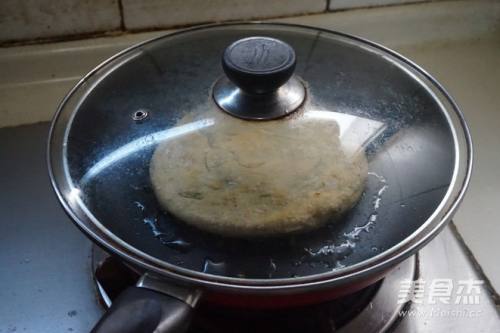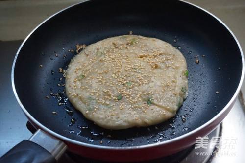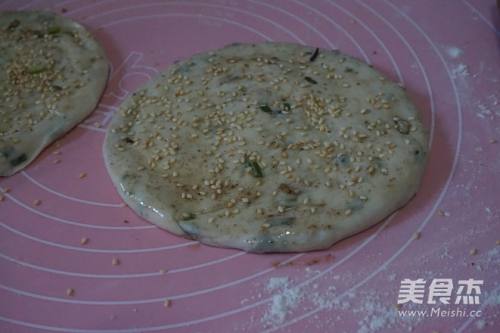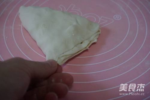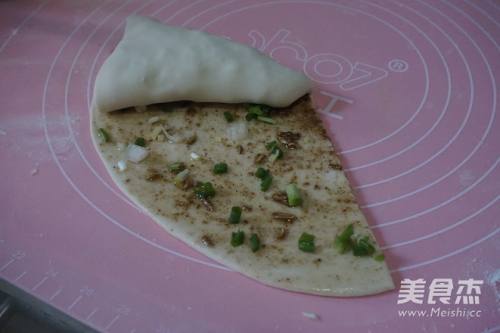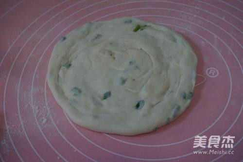6松驰后的面团按家中的大小锅来分团,把面团擀开并划上个刀口,扫上花椒油