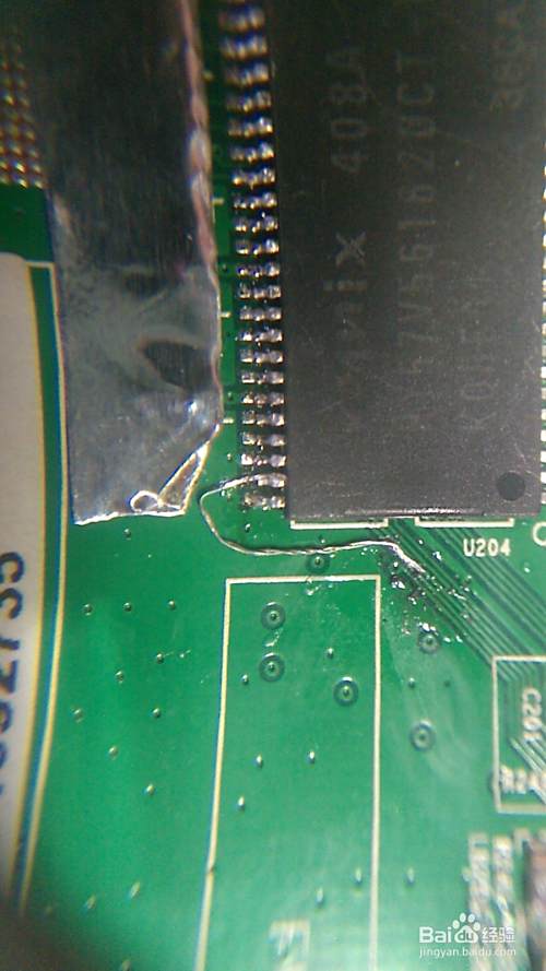 这下不用风枪,用恒温电烙铁,温度380°,刀头烙铁头,将焊盘用锡丝拖一遍,上锡和阻焊剂,把32M内存对齐方向和焊盘,用电烙铁将对角固定,然后开始焊接,焊接就比较简单,只需用烙铁将引脚加热几秒网下压,使其和焊盘融合,不到两分钟焊完!