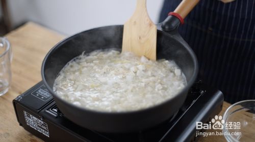 倒入虾皮和豆腐,煮至汤变白变稠,然后加入一小勺盐。