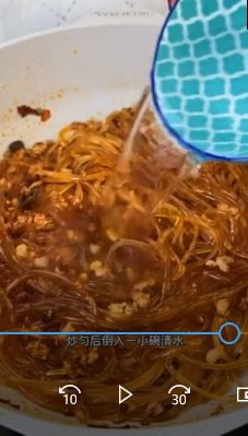 然后放入肉末炒至变色,加入粉条淋点生抽炒匀加水。