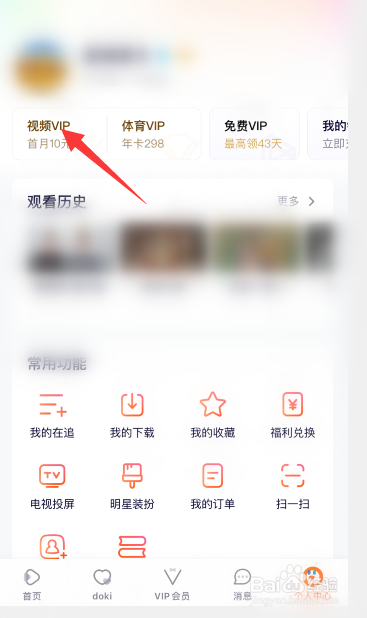 腾讯视频进入个人中心后,点击头像下方的“视频VIP”