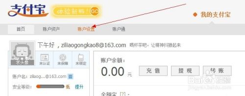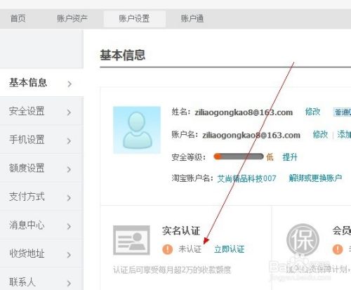 账户已经开通,下面进入支付宝绑定。点击账户设置,选择实名认证,输入基本信息即可完成验证(注:一张身份证可以绑定多个支付宝账号)