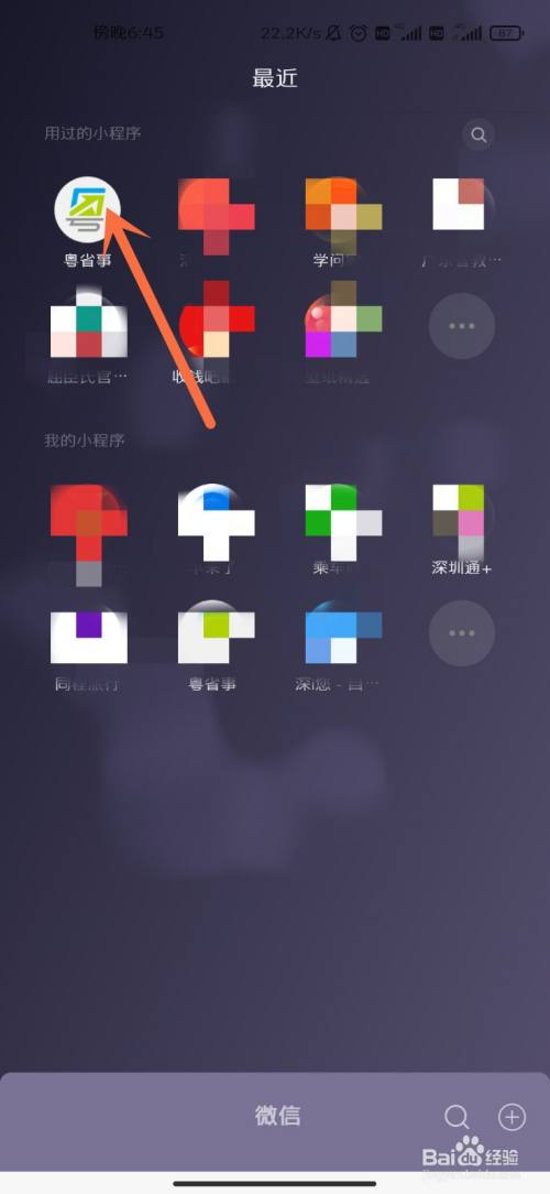 首先在微信近期使用小程序界面,找到小程序“粤省事”,点击进去;