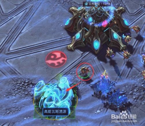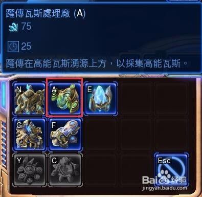 然后我们选中一个探测机点击右下角基础建筑清单B→瓦斯处理厂A(快捷键BA),来陆续建造两个瓦斯处理厂,此资源主要用于高端兵种或者建筑。一个瓦斯处理厂需要配备3个探测机。