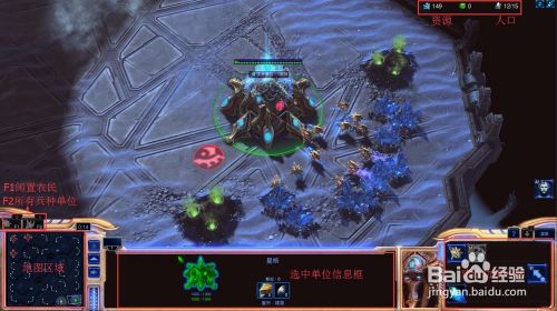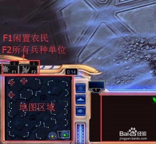 左下角为地图区域以及F1、F2功能键指示,点击F1可以快速选中闲置农民,F2可以快速选中所有兵种单位。