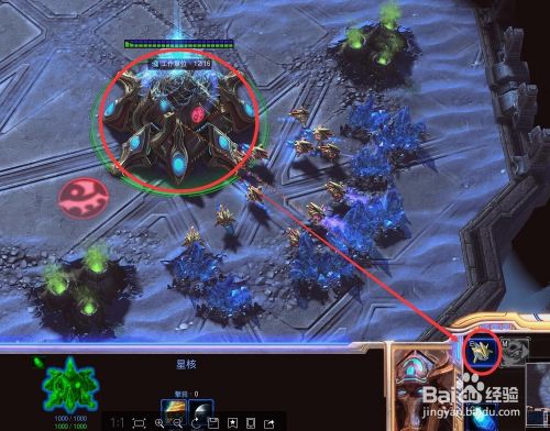 首先刚进入游戏我们就要选中星核,然后点击E生产“农民”探测机,探测机是用来采集资源和建造建筑的,所以农民数量要达到图中星核上面所示的数量要求最佳,一般不是刚开始就要生产农民到最大化的,而是需要合理统筹的,这个需要自己琢磨了。
