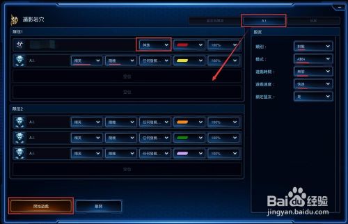 首先点击如图所示的【AI】按钮可以添加电脑玩家,我们可以设置电脑AI的难度、种族等、对战的游戏时间、游戏速度、对战双方的数量,由于这次讲解的是神族,所以我们把自己的种族设置为“神族”,其他AI玩家设置为随机种族,设置好后点击【开始游戏】。