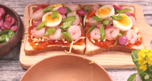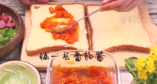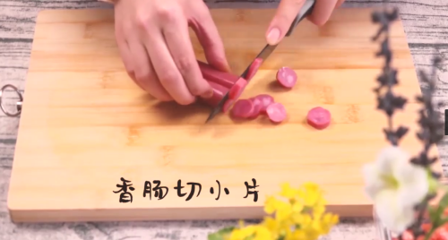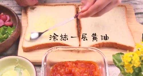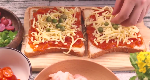 15铺上鸡蛋片、小香肠、荷兰豆。