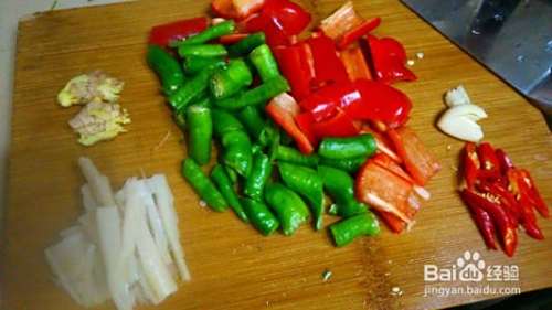 小米椒、青红椒斜刀切片备用、葱姜蒜切碎备用