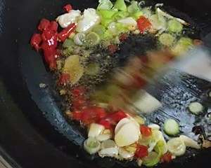 锅中烧油,下入小米椒、葱、姜、蒜、青红椒,小火煸炒出香味