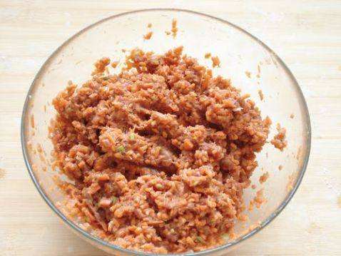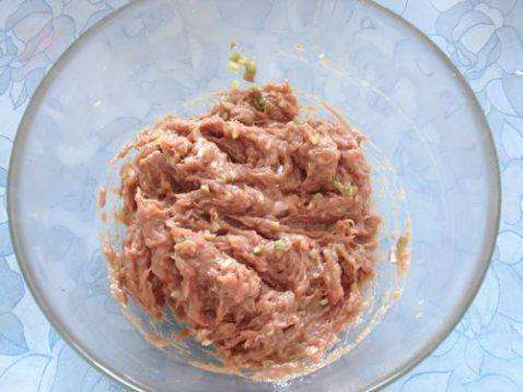 3和牛肉一起放入容器中加入酱油,美极鲜,五香粉,盐,花生油。 顺着一个方向绞打上劲。