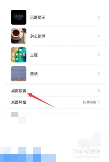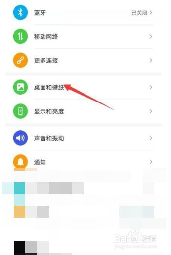 在设置功能界面中,找到并点击桌面和壁纸功能,打开该功能设置界面
