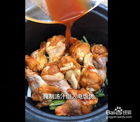 第2步,电饭煲刷油,葱姜垫底,放上翅根,腌制汤汁倒入电饭煲,