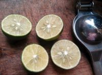 两个柠檬切开备用。用盐巴清洗出来的猪大肠,挤上柠檬汁接着搓揉5分钟,然后清洗。