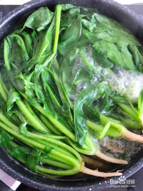 水开放入菠菜焯水,煮一分钟即可过凉水攥干,这次买的根很干净我就没切掉