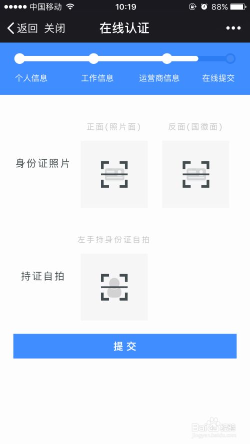 上传身份证正反面和持证自拍照,信息提交成功,等待审核结果。