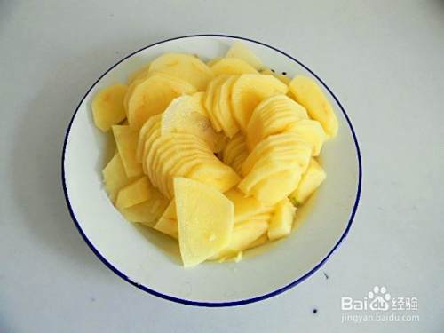 土豆切成大片,要薄一点,用水浸泡10分钟后捞出控干。