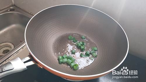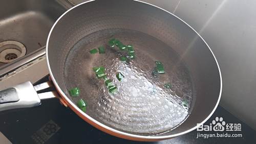 如图,锅内加入适量色拉油,烧至八成热后放入香葱炸出香味。