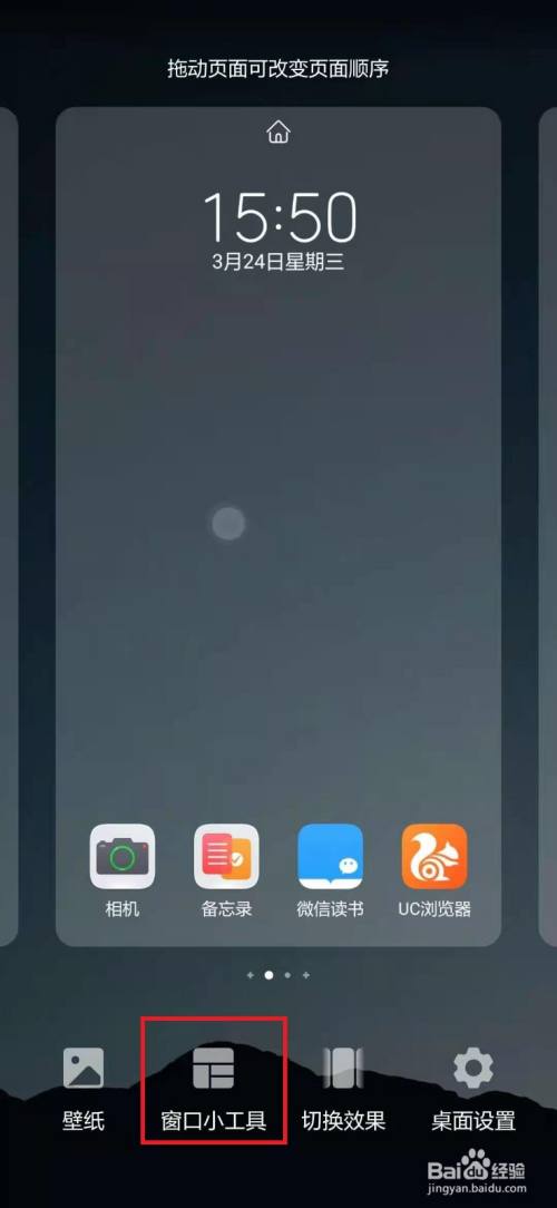 华为手机主屏双指捏合操作,在屏幕下方的菜单中,选择【窗口小工具】