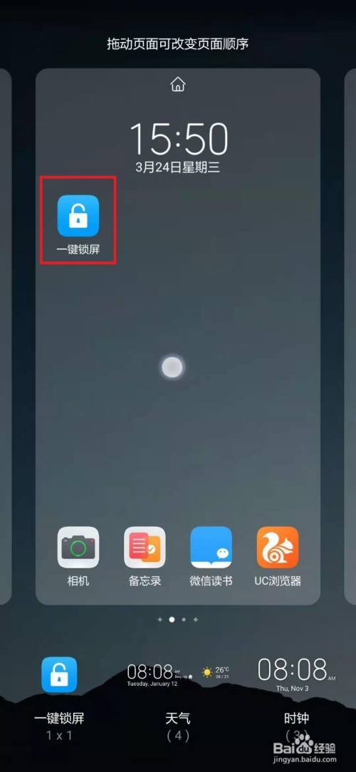 点击屏幕任意地方,退出桌面编辑状态,在手机屏幕上显示一键锁屏,如下图所示。