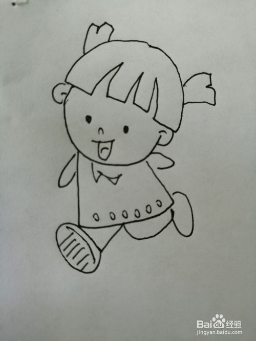 第七步,最后画出小女孩的两只脚,小女孩这会正在走路呢。