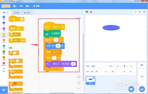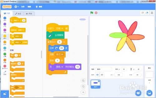 在scratch3.0中,我们可以通过让椭圆旋转、克隆、变色,制作成一个会变色的花瓣动画,其制作方法如下。