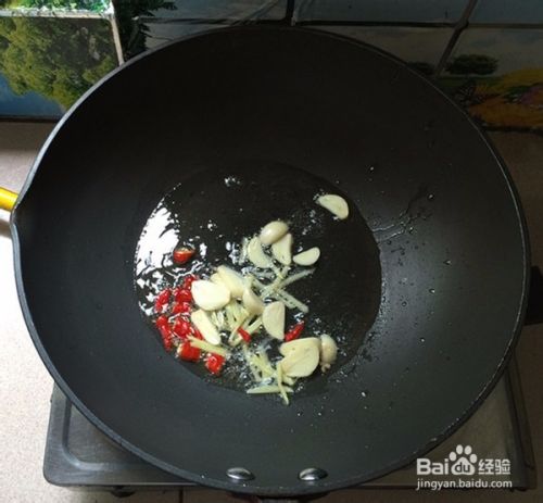 待猪油融化后下姜,蒜和干辣椒